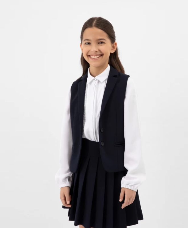 Синий текстильный жилет - привычный атрибут повседневного школьного образа. Он подчеркивает деловой имидж ученицы, красиво завершая любой комплект. Выверенная форма и высокое качество ткани обеспечивают жилету достойный внешний вид, долговечность и неприхотливость в уходе. Синий жилет может служить прекрасной альтернативой пиджаку или кардигану.