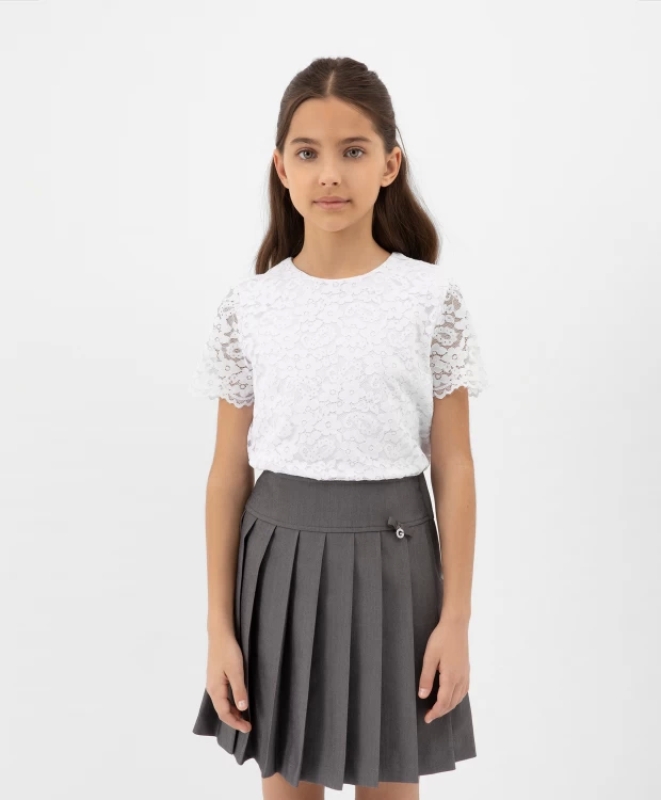 Белая кружевная блузка с коротким рукавом - вариант на все случаи жизни. Она выглядит очень нарядно, при этом максимально проста в эксплуатации и уходе. Благодаря трикотажной основе из хлопка с эластаном, блузка комфортна и приятна к телу. Кружево делает блузку благородной и элегантной, идеальной и для будней, и для праздников ученицы.