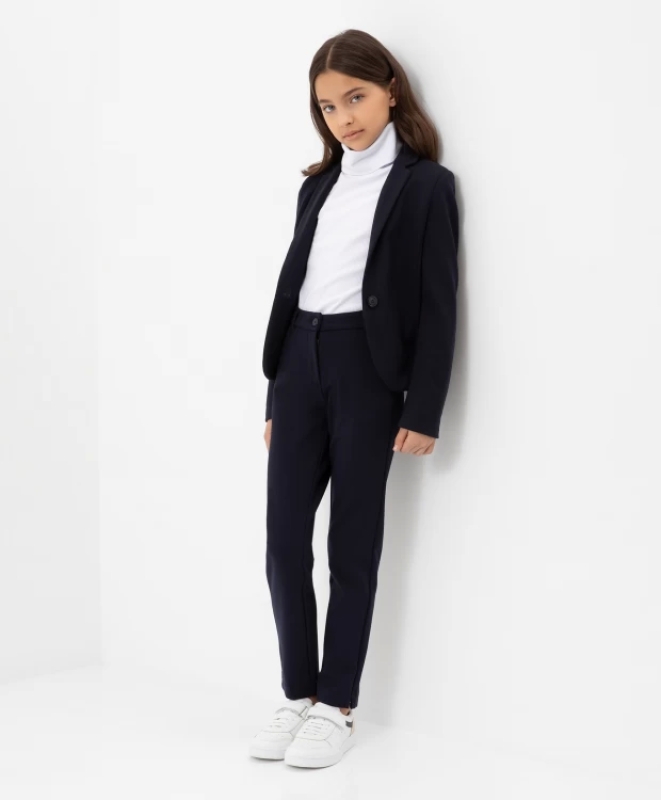 Строгий синий жакет, выполненный из джерси, - прекрасная альтернатива текстильному пиджаку! Он обладает теми же функциональными качествами, при этом более пластичен, комфортен, легок в эксплуатации и уходе. Жакет отлично держит форму и не мнется. В оформлении модели использован деликатный репсовый бантик с металлической навеской, придающий модели завершенность. С любой блузкой, футболкой, водолазкой, жакет составит гармоничный комплект, создающий стильный и деловой образ ученицы.