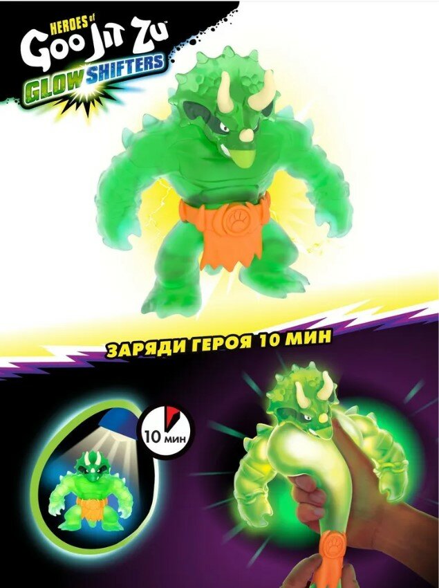 3. Тянущиеся фигурки Гуджитсу растягиваются в 3 раза и легко возвращаются к своей первоначальной форме и размеру. В новой линейке Гуджитсу Глоу Шифтрес монстры-герои активируют внутреннюю силу ГУ, чтобы сражаться в темноте. Тело Тритопса окрашено в зеленый цвет и имеет мягкий наполнитель с жидкостью. А если выключить свет, Тритопс будет светиться в темноте. Теперь ему любая тьма нипочем! Ищите других персонажей Гуджитсу серии Глоу Шифтерс: Тайро, Блейзагот, Бенгал, Скорпиус и ультраредкий Гигабивень с особой силой Гу - Водная Атака.