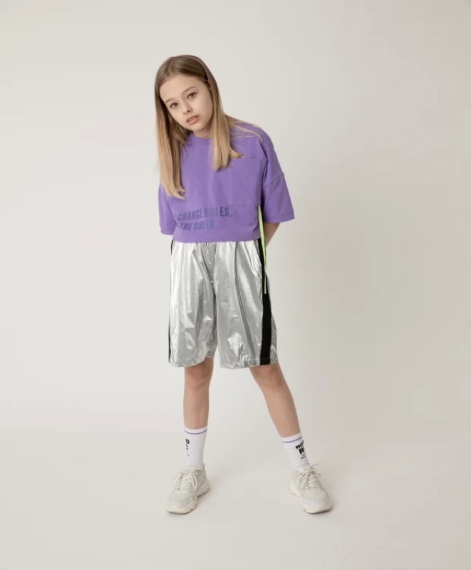 Шорты, выполненные из плащевого полотна с серебристым накатом на подкладке из сетки – это новый модный ассортимент, который не оставит равнодушной активную спортивную девочку. В сезоне Весна/Лето 2021 такие шорты будут восприниматься так же естественно, как традиционнные модели из джинсы или трикотажа. Шорты с высокой посадкой имеют пояс на резинке с множеством декоративных отстрочек и крупным патчем (нашивкой) с резиновым шрифтовым принтом. На боковых швах расположены настрочные лампасы, подчеркивающие спортивный характер модели.