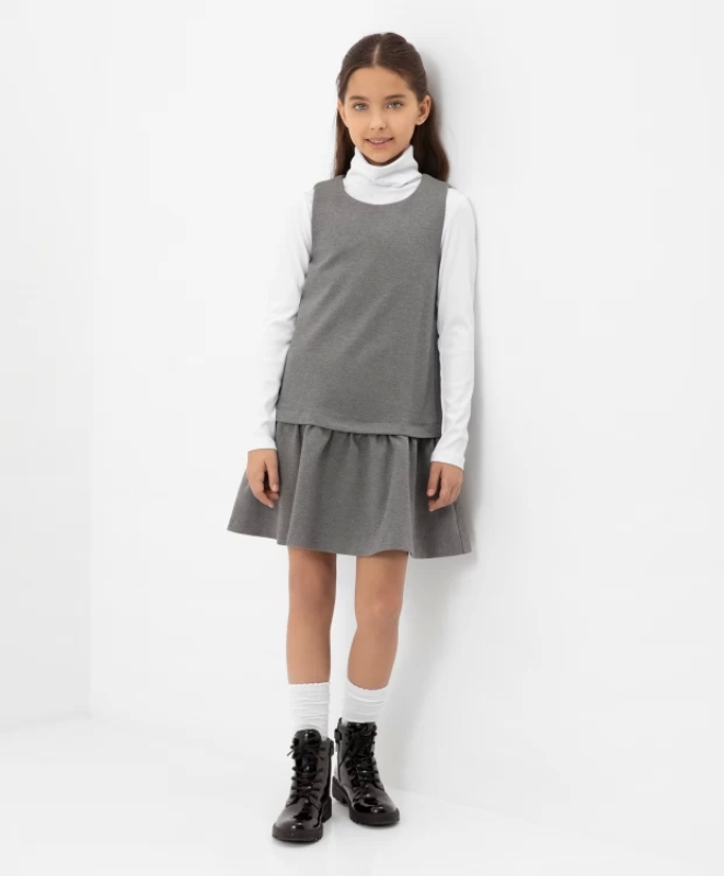 Серый сарафан из джерси трапециевидного силуэта с заниженной линией талии - отличный вариант для будней школьницы. Выполненный из мягкого формоустойчивого трикотажного полотна, сарафан практичен, удобен в эксплуатации и прост в уходе. Изюминка модели - имитация многослойности, полученная благодаря крупной застроченной складке на стыке верхней части и юбки. В оформлении сарафана использован деликатный репсовый бантик с изящным металлическим декором.