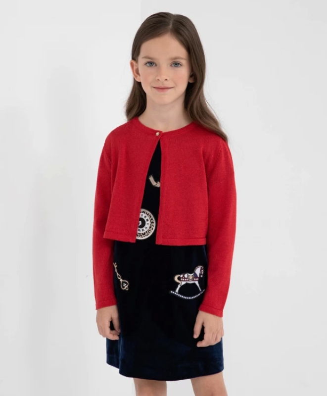 Нарядный кардиган, связанный гладью из мягкой пряжи с добавления люрекса, сделает образ девочки нежным и утонченным. Кардиган застегивается на одну пуговицу. Спинка кардигана оформлена изящной золотистой табличкой.
