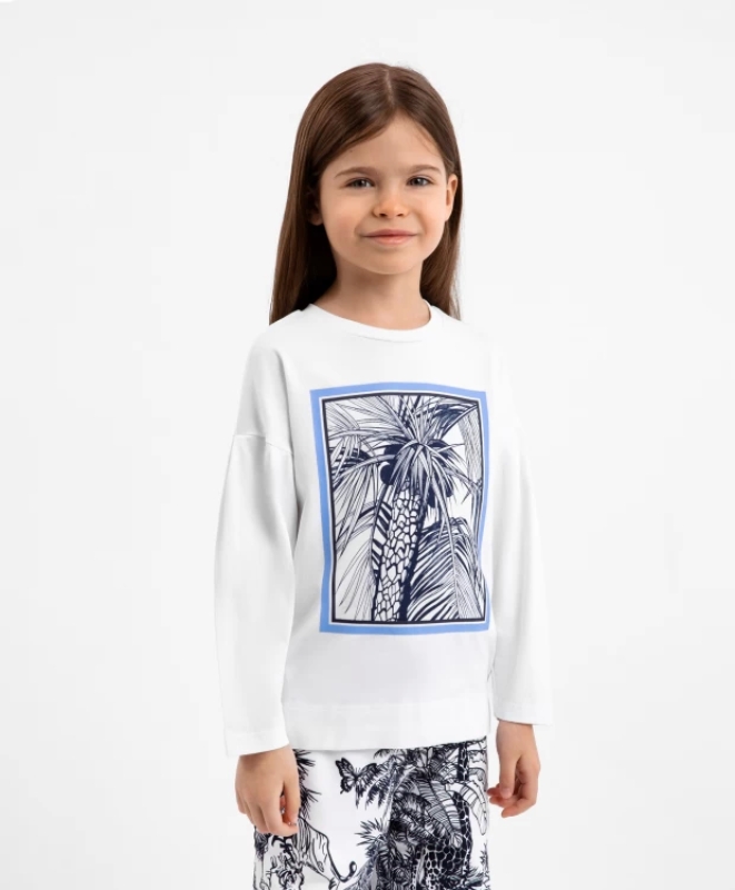Белая футболка с длинным рукавом станет базовым элементом для многих весенних образов. Модная объемная форма, спущенное плечо, широкая подгибка низа с разрезами по боковым швам создают современный силуэт, формирующий свободный непринужденный образ. Оригинальный декор, решенный в линеарной графике, делает футболку стильной, интересной, запоминающейся. В оформлении футболки использована жаккардовая нашивка с шрифтовыми элементами.