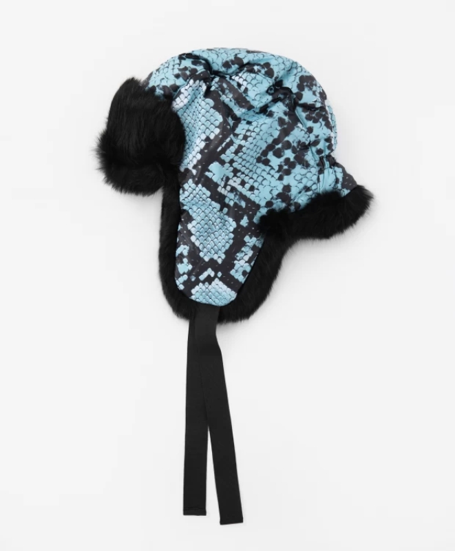 Теплая шапка-ушанка на подкладке из флиса выполнена из плащевки с модным анималистическим рисунком. Шапка отделана натуральным мехом кролика.