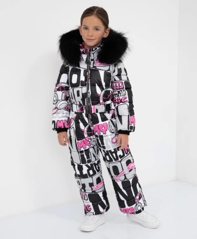 Стеганый зимний комбинезон на искусственном пуху выполнен из плащевки с ярким динамичным экстравагантным рисунком. Однотонные детали: капюшон и внутренняя стойка воротника цвета фуксия создают контраст и делают модель стильной и убедительной. Натуральный мех енота на капюшоне способствует ощущению тепла, защищенности, уюта, необходимого для зимней вещи. Комбинезон имеет снегозащитные манжеты и молнии в боковых швах, позволяющие носить обувь разной высоты и объема. Модель дополнена съемным эластичным поясом с металлической пряжкой.