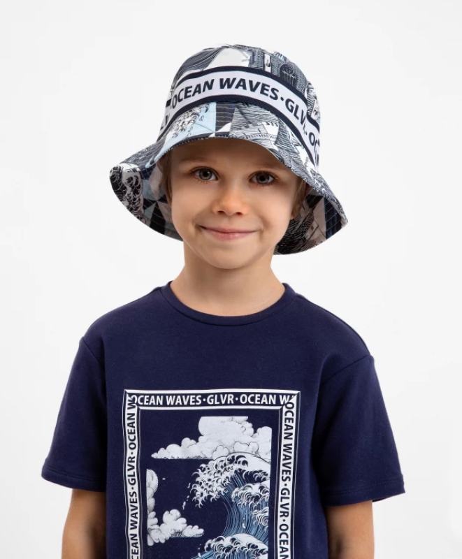 Легкая хлопковая панама без подкладки - отличный аксессуар для жары. Панама выглядит стильно и небанально благодаря модному интересному рисунку и акцентной детали - широкой репсовой тесьме с шрифтовыми элементами.