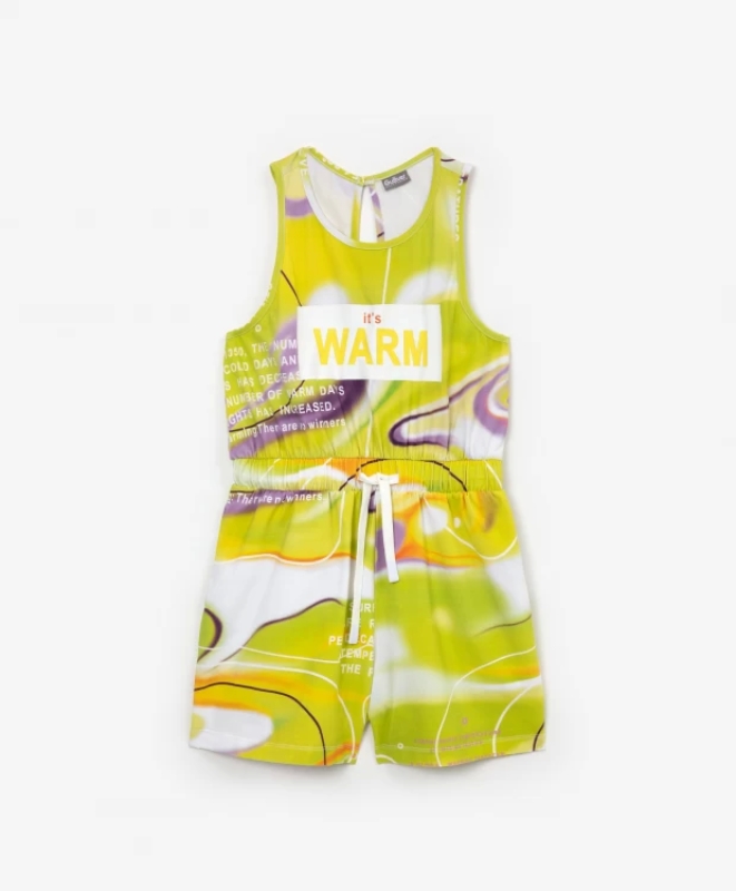 Стильный трикотажный комбинезон, выполненный из мягкого, приятного на ощупь трикотажного полотна с модным акварельным рисунком, акцентирующим внимание на главном тренде весенне-летнего сезона - глитч(glitch) эффекте: нечеткость, размытость, искаженность изображения, - яркий акцент летнего образа. В оформлении комбинезона использован крупный неконтрастный шрифтовой принт. Комбинезон имеет карманы в боковых швах, необходимые для комфорта подростка.