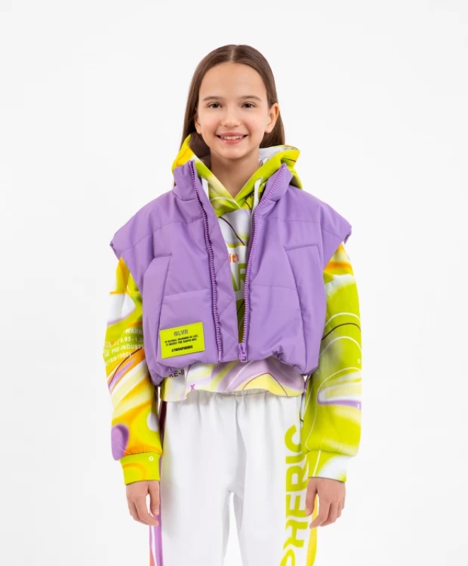 Объемный укороченный жилет трендового сиреневого цвета - стилеобразующий элемент весеннего образа. Акцентными элементами жилета являются крупные широкие лИсточки в оформлении карманов и яркая резиновая нашивка с шрифтовыми изображениями. С брюками, джинсами, кюлотами, жилет будет выглядеть интересно и небанально, подчеркивая модные современные пропорции в разных образах.