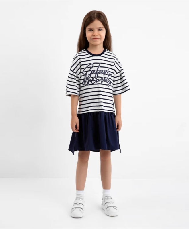 Стильное платье, построенное на сочетании полосатого трикотажного полотна и синей глади в текстиле, рождает самые приятные ассоциации, связанные с морским стилем. Благодаря спущенному плечу, трапециевидной форме, комфортному объему, платье формирует непринужденный расслабленный силуэт, иллюстрируя простоту и демократичность современной моды. Оно будет незаменимо жарким летом, когда так важно ощущать легкость и свободу движений. В оформлении платья использована нашивка с шрифтовыми элементами.