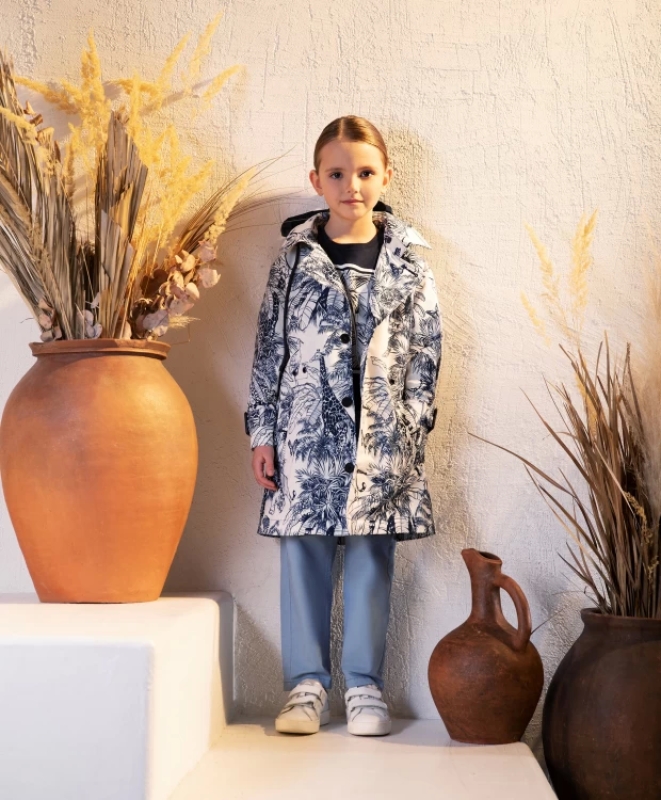 Яркий эффектный тренч - стилеобразующий элемент весеннего гардероба. Выполненный из плащовки с модным интересным рисунком в технике "Туаль де Жуи", тренч позволит сформировать несколько красивых элегантных образов. Дизайн модели построен на сочетании орнаментальной и однотонной плащовок. Отстегивающийся капюшон и широкая кокетка спинки, выполненные из глади, а также крупный размашистый шрифтовой принт уравновешивают орнаментальное буйство основного материала, делают тренч острее, интереснее, ярче. Тренч застегивается на пуговицы. Он имеет карманы, необходимые для комфорта девочки. При желании можно воспользоваться внутренней утяжкой, защищающей от ветра и корректирующей силуэт.