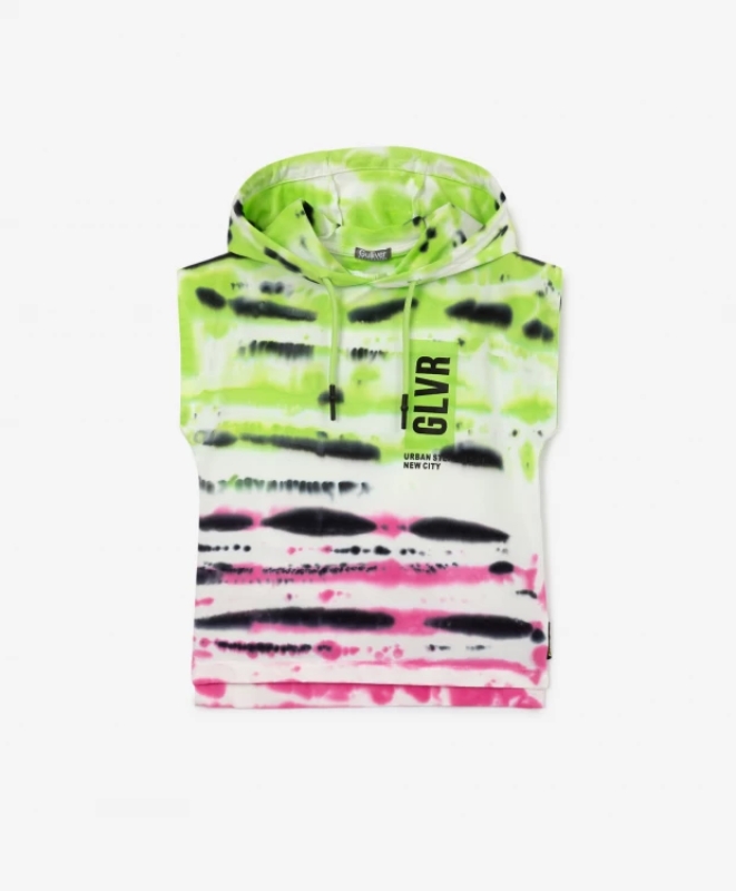 Стильный жилет из тонкого футера - прекрасный летний вариант. Выполненный из трикотажного полотна с модным рисунком в стиле тай-дай, жилет привлекает остротой и неординарностью дизайна. Объемный, свободный, с удлиненной линией плеч и заниженной линией спинки, жилет с капюшоном может быть как составляющим многослойного комплекта с футболкой, так и носиться как самостоятельное изделие. В комплекте с шортами из денима, текстиля, трикотажа, жилет составит яркий летний комплект, подчеркивающий смелый неординарный образ мальчика. В оформлении жилета использован шрифтовой принт, брендированный флажок, корды с пластиковыми наконечниками.