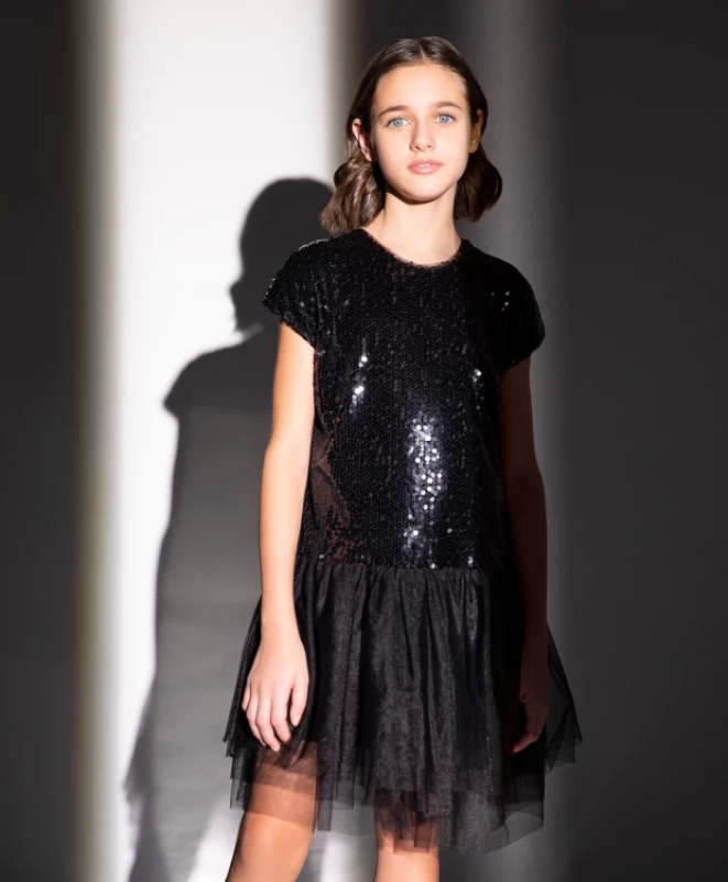 Это платье - размышления на тему "маленького черного платья", которое должно быть в гардеробе каждой представительницы прекрасного пола. Легкое, воздушное, изящное, платье, построенное на сочетании трех фактур: материала, расшитого пайетками, фатина на пышной юбке и тонкой сетки на спинке, платье выглядит очень стильно и элегантно. И с высокими грубыми ботинками, и с аккуратными туфельками, платье составит яркий выразительный образ, подчеркивающий уникальный стиль девочки.