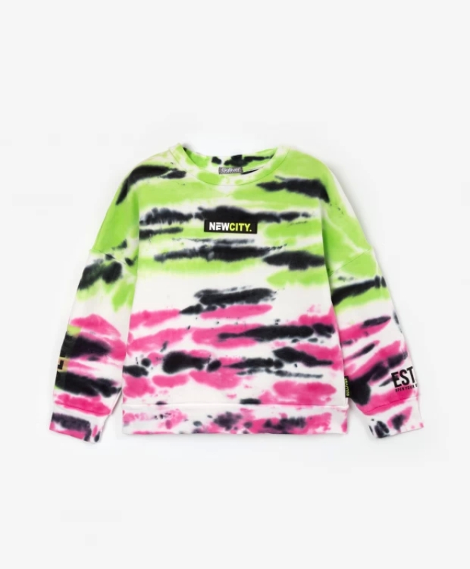 Стильная нераспашная толстовка - прекрасный повседневный вариант! Выполненная из мягкого футера с насыщенным и интересным рисунком в стиле тай-дай(tie dye), толстовка со спущенным плечом объемной комфортной формы станет главным элементом в гардеробе мальчика. В оформлении толстовки использованы нашивки и принты с шрифтовыми элементами.