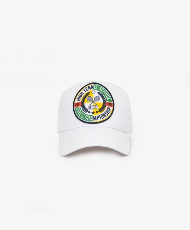 Белая бейсболка с крупной круглой нашивкой - идеальное завершение образа в спортивном стиле.