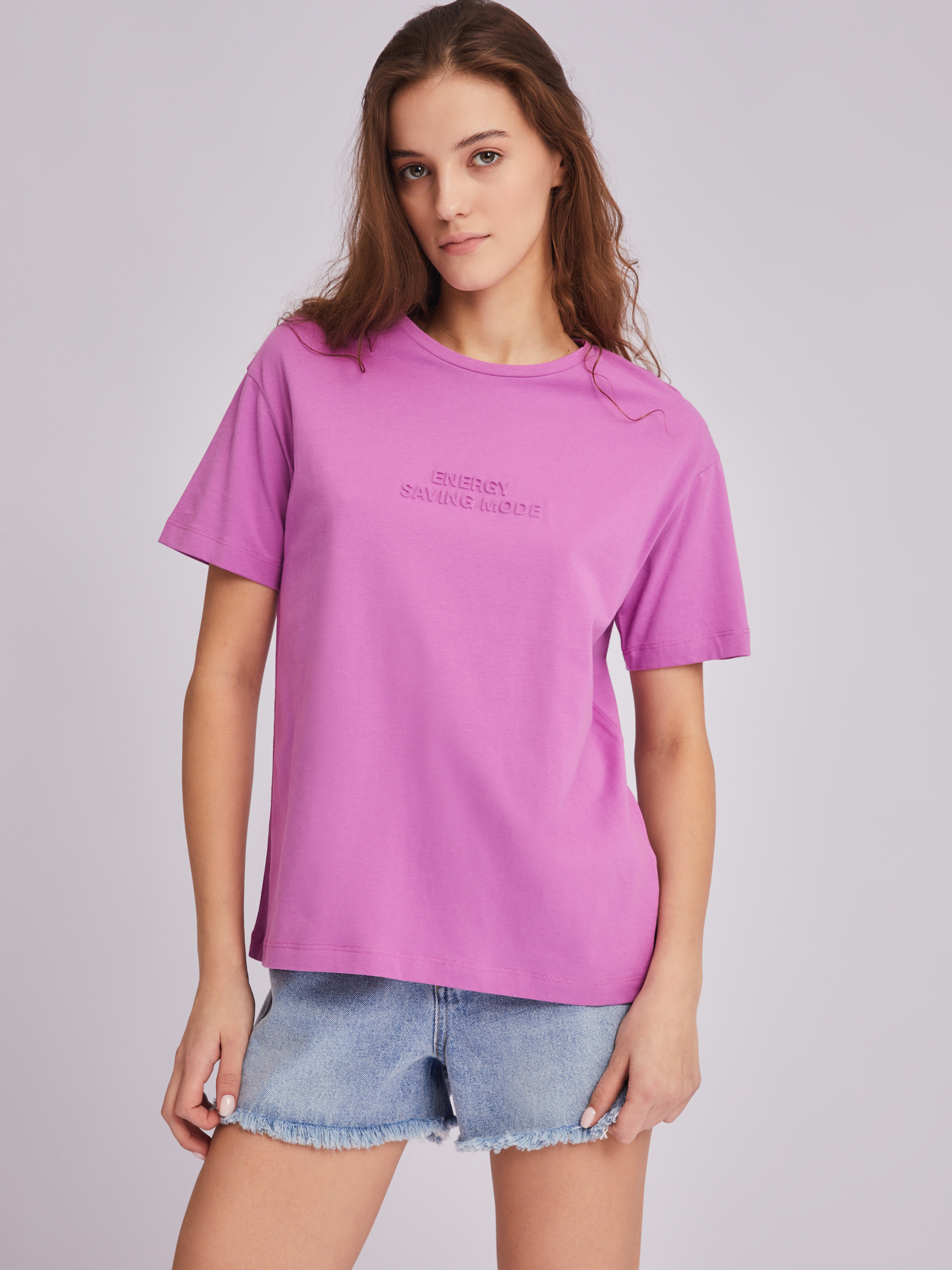 Фиолетовая женская футболка из хлопка, дополненная принтом-надписью на груди, прекрасно подойдёт к ярким летним аутфитам и будет удачно сочетаться с джинсами, шортами и лёгкими юбками.
