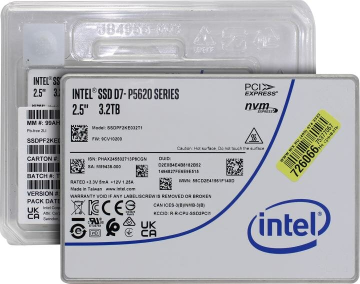 Накопитель SSD 2.5'' Intel D7-P5620 3.2TB PCIe NVMe 4.0 x4 TLC 6700/3600MB/s IOPS 1000/341K MTBF 2M SSDPF2KE032T1N1