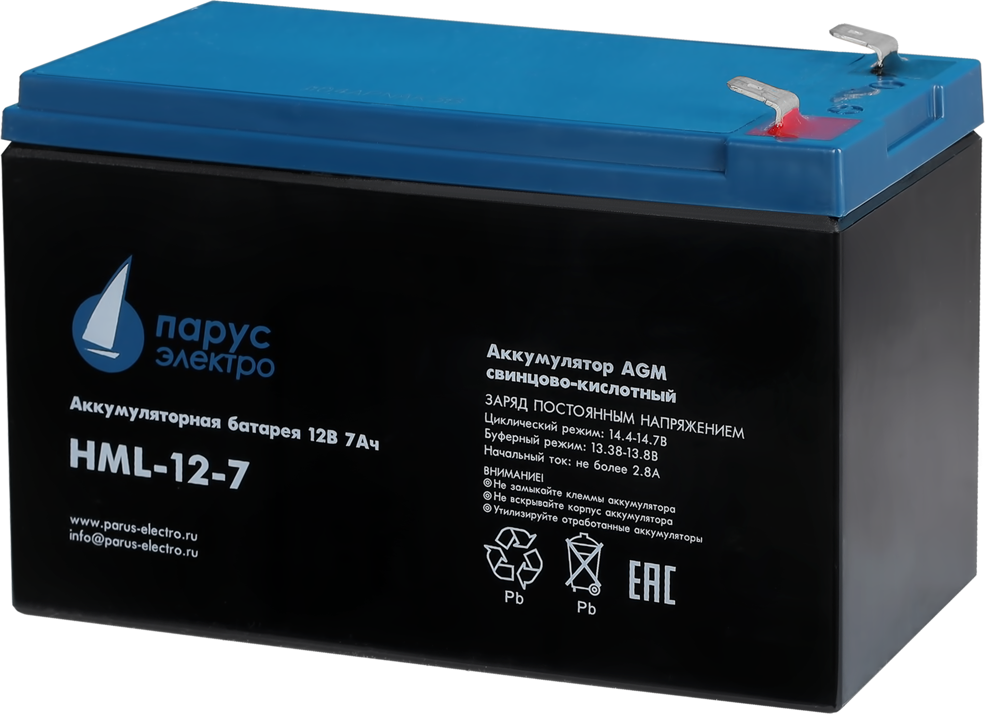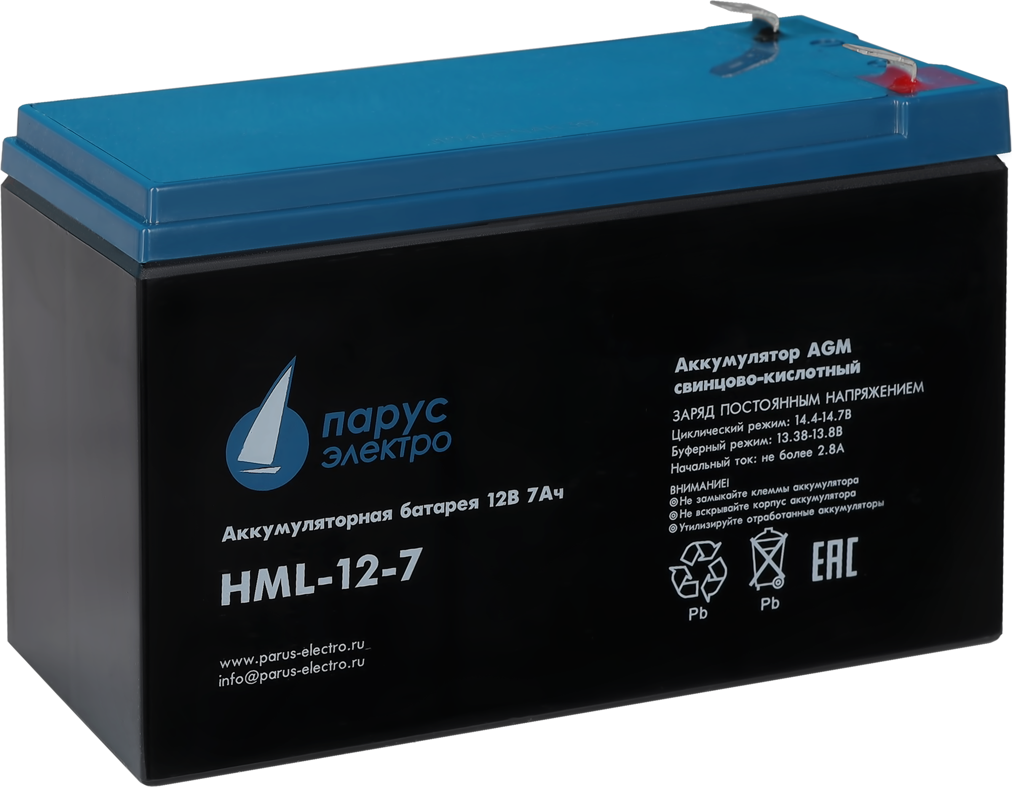 Батарея Парус Электро, профессиональная серия HML-12-7, напряжение 12В, емкость 7.2Ач (разряд 20 часов), макс. ток разряда (5сек) 140А, макс. ток заряда 2.8А, свинцово-кислотная типа AGM, клеммы F2, Д