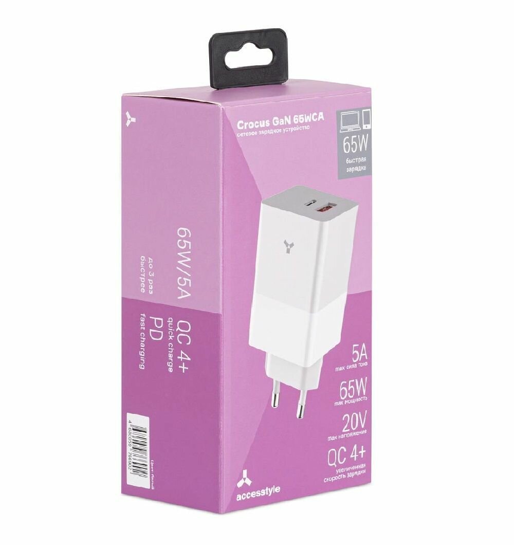 Зарядное устройство Crocus GaN 65WCA выполнено в компактном, стильном корпусе, изготовленном из прочного пластика. Материал устойчив к перепадам напряжения и температур, негативным механическим воздействиям. Модель отличается небольшим весом и компактными габаритами, не займёт много места в сумке или в полке рабочего стола.