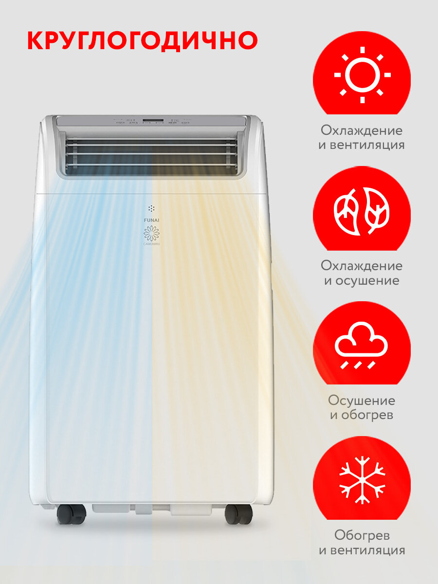 Мобильные кондиционеры FUNAI серии CAMOMIRU — это инновационные технологии, современное производство и актуальные дизайнерские решения. Инженеры и дизайнеры FUNAI создали серию мобильных кондиционеров CAMOMIRU, высокая эффективность и удобный функционал которых открывает пользователю новые возможности комфорта. Стильная и эффектная панель управления с полной индикацией режимов работы кондиционера — 4 режима работы: охлаждение, обогрев, осушение и вентиляция. Интегрированы системы автоматической работы и автоматического испарения конденсата, основной задачей которых является обеспечение удобства в эксплуатации. Комфортный климат круглый год. Особая конструкция вентиляторного блока позволяет снизить уровень шума кондиционера. УСТАНОВКА ТАЙМЕРА. Вы можете устанавливать таймер как на включение, так и на отключение прибора. Оптимизируя время работы прибора, вы сможете значительно сэкономить на расходах на электроэнергию АВТОМАТИЧЕСКОЕ ИСПАРЕНИЕ КОНДЕНСАТА. Кондиционер оборудован системой испарения конденсата. Резервуар с водой никогда не заполняется полностью. Слив воды необходим только в конце сезона. 4 РЕЖИМА РАБОТЫ. Охлаждение, обогрев, осушение, вентиляция. РЕЖИМ SMART. В режиме SMART прибор автоматически выбирает режим работы охлаждения, обогрева, вентиляции. НОЧНОЙ РЕЖИМ. Функция используется для комфортной работы в ночное время. Прибор начнет работать в режиме охлаждения. Когда вы используете ночной режим, яркость экрана снижена, а скорость вентилятора низкая.