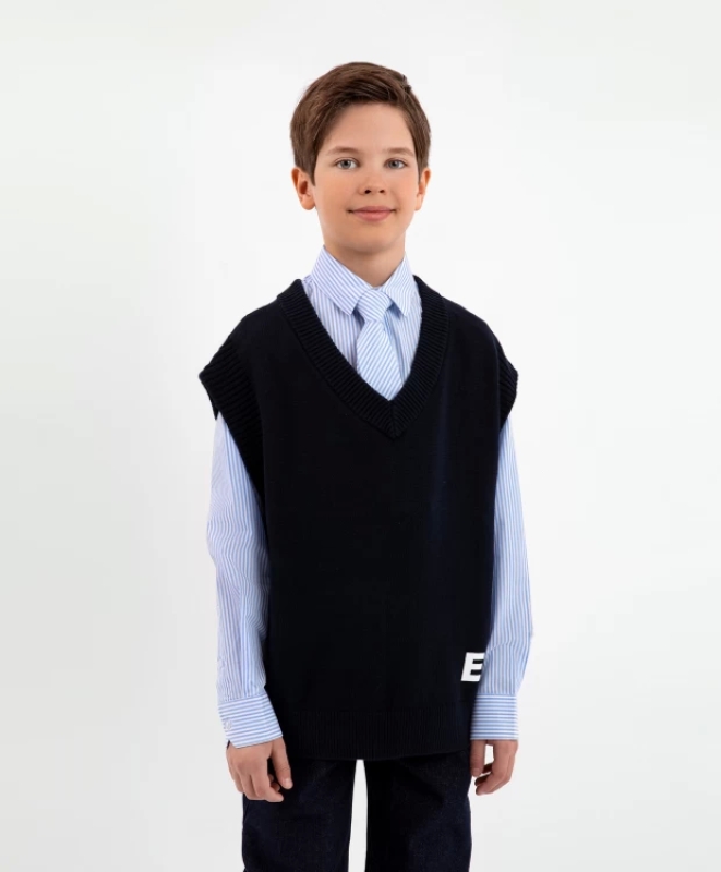 Синий жилет свободной объемной формы с заниженным плечом прекрасно дополнит школьный комплект в стиле casual. Контрастный шрифтовой принт, расположенный асимметрично, с переходом с переда на спинку, придает модели яркие индивидуальные черты, подчеркивает неформальный подход к созданию школьного образа.