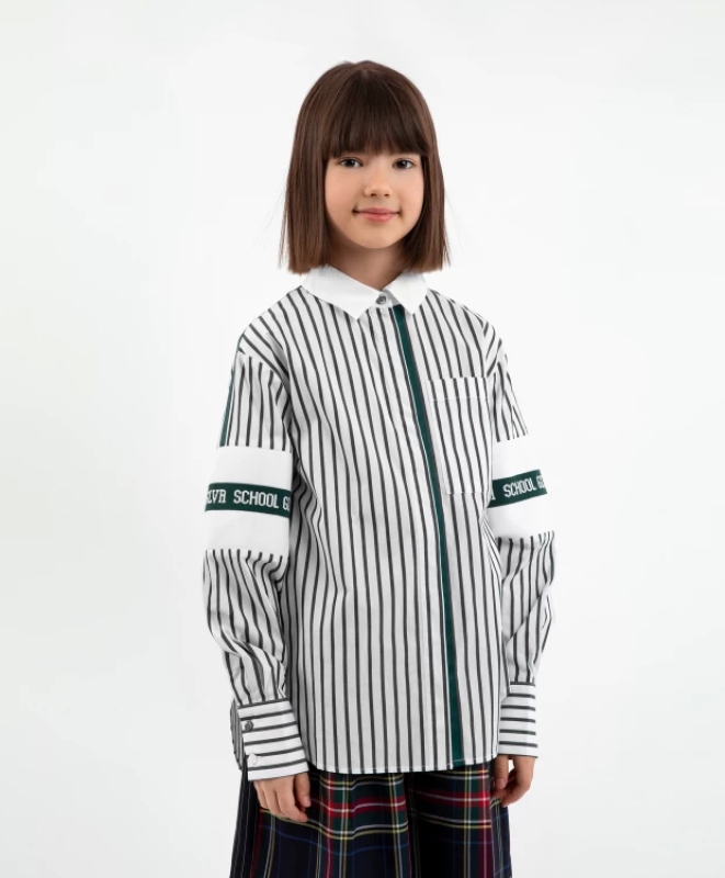 Яркий элемент школьного образа и не только - блузка прямого свободного силуэта в полоску! Если в школе приветствуется проявление индивидуальности при соблюдении делового стиля ученика, блузка в полоску - свежий, яркий, модный вариант. Решенная в лучших традициях стиля preppy, блузка привнесет в образ девочки остроту и динамику. Дизайн модели построен на сочетании фактур и контрастных отделочных деталях. Трикотажные вставки с жаккардовой полоской на рукавах и шрифтовыми элементами, репсовая тесьма в оформлении изделия делают блузку небанальной, существенно отличающейся от привычных школьных блузок с жабо или рюшами. Она станет стилеобразующим элементом образа, подчеркнув безукоризненный вкус своей обладательницы и соответствие модным трендам.