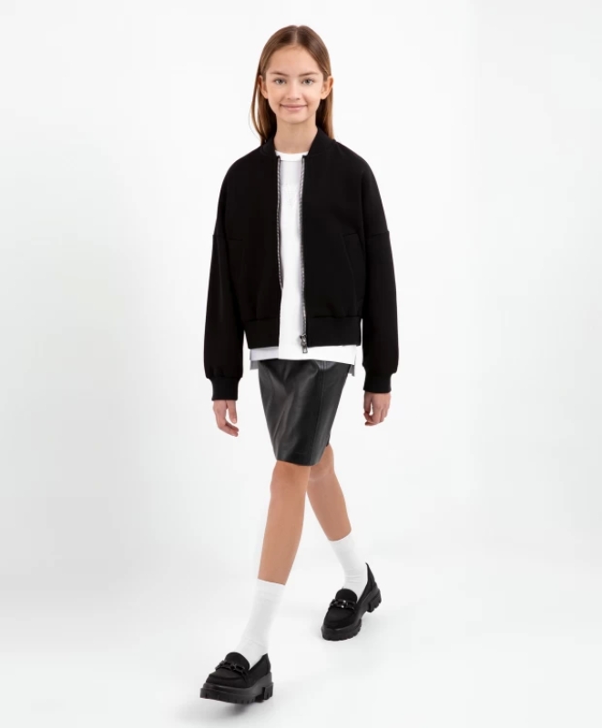 Юбка-карандаш всегда выглядит стильно, лаконично, элегантно. Она способствует созданию делового образа, в полном соответствиии с дресс-кодом учебных заведений. Особенность этой модели в сочетании плотного трикотажного полотна джерси на задней части и эко-кожи на передней стороне юбки. Сочетание фактур - не только актуальный тренд, формирующий новое восприятие базовой вещи, но и возможность сделать изделие более комфортным для ребенка. Выстроченные вертикальные рельефы на передней части подчеркивают стройный силуэт девочки. Широкая эластичная тесьма с деликатным шрифтовым декором, служащая поясом, создает удобство и дополняет модель интересной фактурой. Юбка застегивается на акцентную металлическую молнию, расположенную в боковом шве.