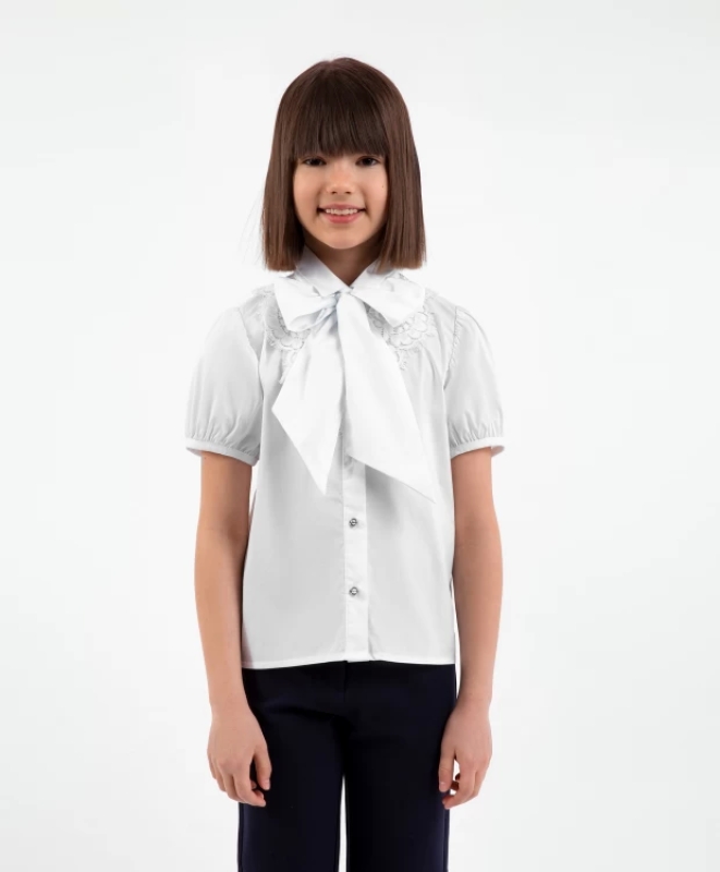 Белая блузка с коротким рукавом - идеальное решение для теплых классов! Благодаря сочетанию фактур гладкого текстиля и кружева, имитирующего манишку, блузка выглядит очень нарядно. Рукава-фонарики и пуговицы с крупными стразами усиливают впечатление от модели, делают блузку легкой и романтичной. Блузка дополнена съемным бантом, красиво завершающим нарядный образ. В оформлении модели использован репсовый бантик с навесной декоративной деталью, расположенный на спинке.