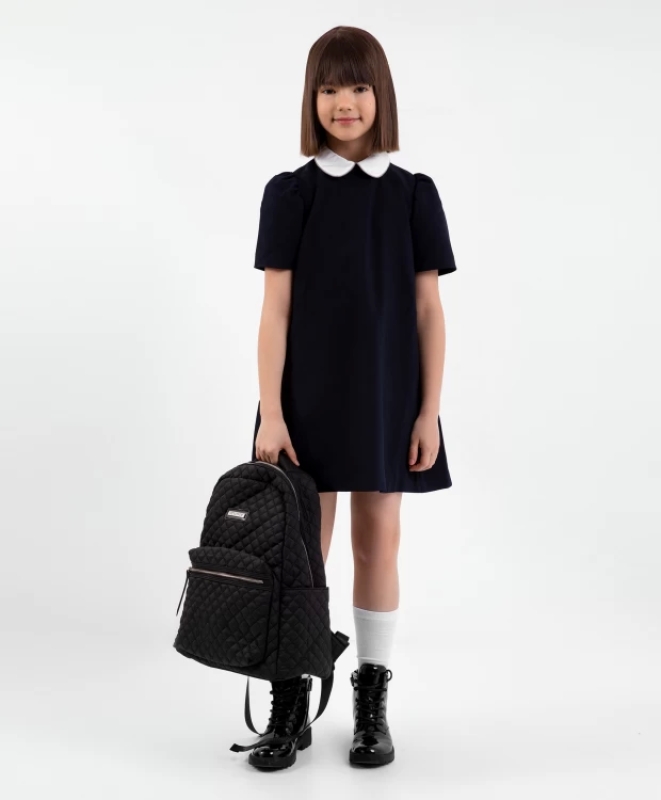 Стильное синее платье из плотного формоустойчивого текстиля - образец элегантности, утонченности, культуры в подаче образа. Благодаря присборенным рукавам-фонарикам и присборенной отрезной детали спинки, платье выглядит очень нежно и романтично. Отстегивающийся белый воротник с деликатной металлической цепочкой придает модели свежесть и обаяние. Платье имеет шелковистую вискозную подкладку, способствующую комфортному скольжению изделия при движении. Платье застегивается на потайную молнию на спинке.