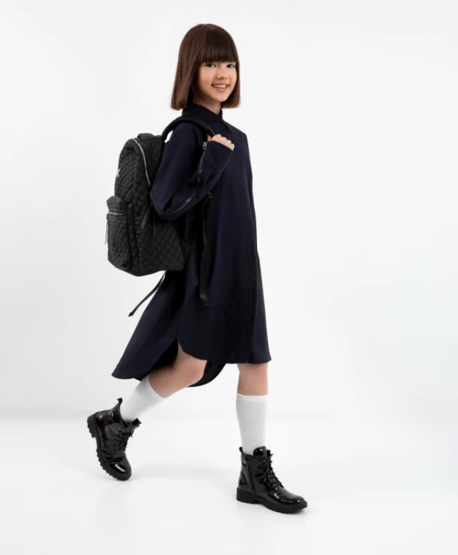 Синяя блузка свободной объемной формы со спущенным плечом и удлиненной линией спинки выполнена из хрустящего, приятного на ощупь поплина. Дизайн модели построен на интересном конструктивном членении, подчеркнутом серебристой металлической молнией, идущей от края одного рукава до края другого через спинку непрерывно. Функциональная молния позволяет обнажить часть руки, привнося в образ подростка свободу, легкость и непринужденность стиля casual. Блузка застегивается на пуговицы, скрытые элегантной суппатной планкой.