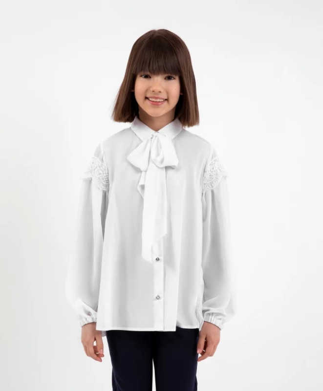 Элегантная белая блузка - идеальный вариант для торжественных моментов в жизни школьницы. Построенная на комбинации двух материалов - поплина и шифона, блузка выглядит очень нарядно, интересно, свежо. Плиссированная спинка и объемные рукава из шифона делают силуэт летящим, легким, воздушным. Широкое кружево подчеркивает эксклюзивность модели, а также обогащает ее красивой фактурой. Блузка застегивается на пуговицы с крупными стразами. Съемный шифоновый бант придает модели цельность и завершенность.