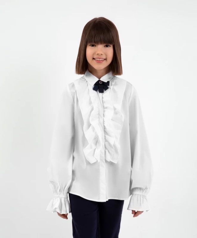 Белая блузка с чередой воланов вдоль планки - непременный атрибут нарядного школьного образа. Небольшая сборка на спинке делает блузку более легкой, воздушной, летящей. Акцентные рукава придают блузке изящество и индивидуальность. Блузка застегивается на пуговицы, скрытые элегантной суппатной планкой. В комплекте с блузкой можно использовать съемный контрастный бант из репсовой тесьмы с деликатным навесным элементом, украшенным стразами.