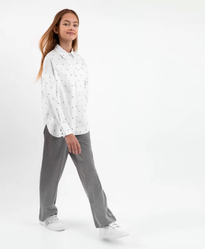 Серые меланжевые трикотажные брюки из плотного формоустойчивого джерси - стильный, удобный, практичный вариант! Лаконичная прямая форма, модный свободный крой делают брюки очень комфортными, позволяющими считать их лучшим базовым низом. Брюки напоминают те самые, полюбившиеся подросткам "трубы", идеально подходящие к любой спортивной и кэжуальной обуви - кедам, кроссовкам, ботинкам. Пояс на резинке с дополнительной утяжкой способствует хорошей посадке изделия на девочках разного телосложения.
