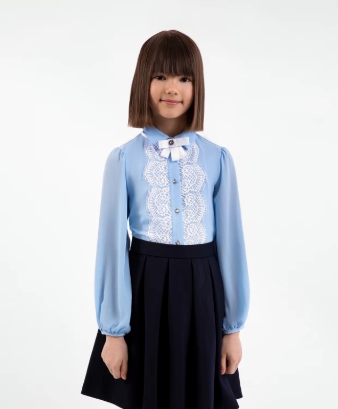 Нежная голубая блузка с белым кружевом, расположенным вдоль планки, - прекрасный вариант как на каждый день, так и для торжественных случаев. Особенность модели - комбинация трикотажного полотна на спинке и полочке с воздушным шифоном на объемных рукавах. Это решение сделало блузку чрезвычайно мягкой и комфортной, не сковывающей движений, и очень нарядной, элегантной, одновременно. Блузка дополнена съемным бантом из репсовой тесьмы с деликатной навесной деталью. В оформлении блузки использованы пуговицы с крупными стразами.