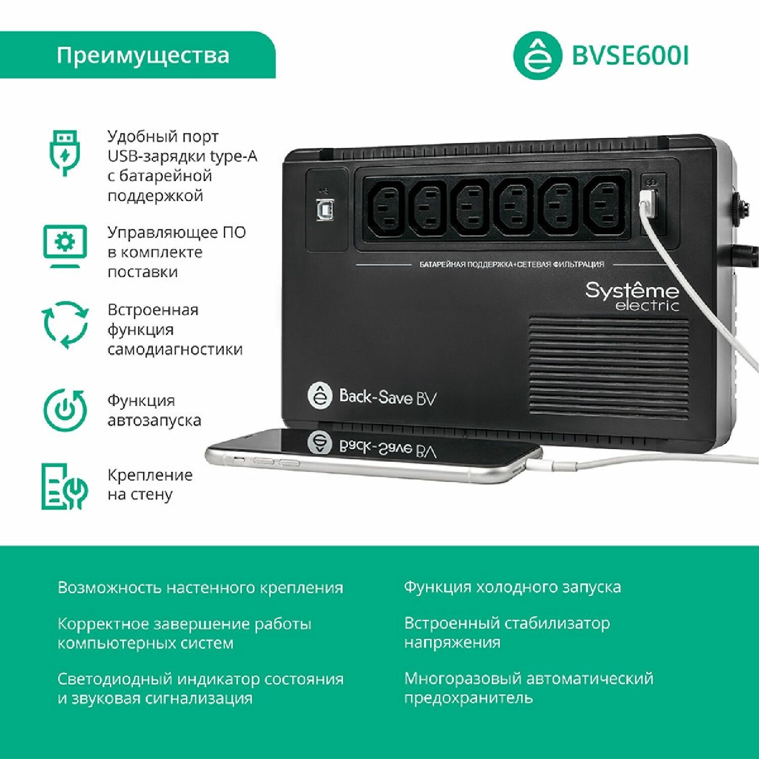 Источник бесперебойного питания Systeme Electriс Back-Save, 600VA/360W, 230V, Line-Interactive, AVR, 6xC13 Outlets, USB charge(type A), USB (BVSE600I) Systeme Electric