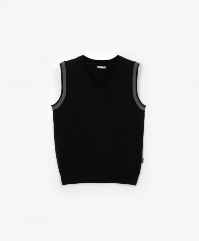 Вязаный синий жилет - непременная составляющая школьного гардероба! Кроме того, что жилет создает тепло и комфорт, что очень актуально в прохладных классах осенью и весной, он делает образ мальчика строгим, элегантным, солидным. Контрастная отделка проймы из серой меланжевой пряжи придает жилету завершенность. В оформлении жилета использована металлическая брендированная табличка.