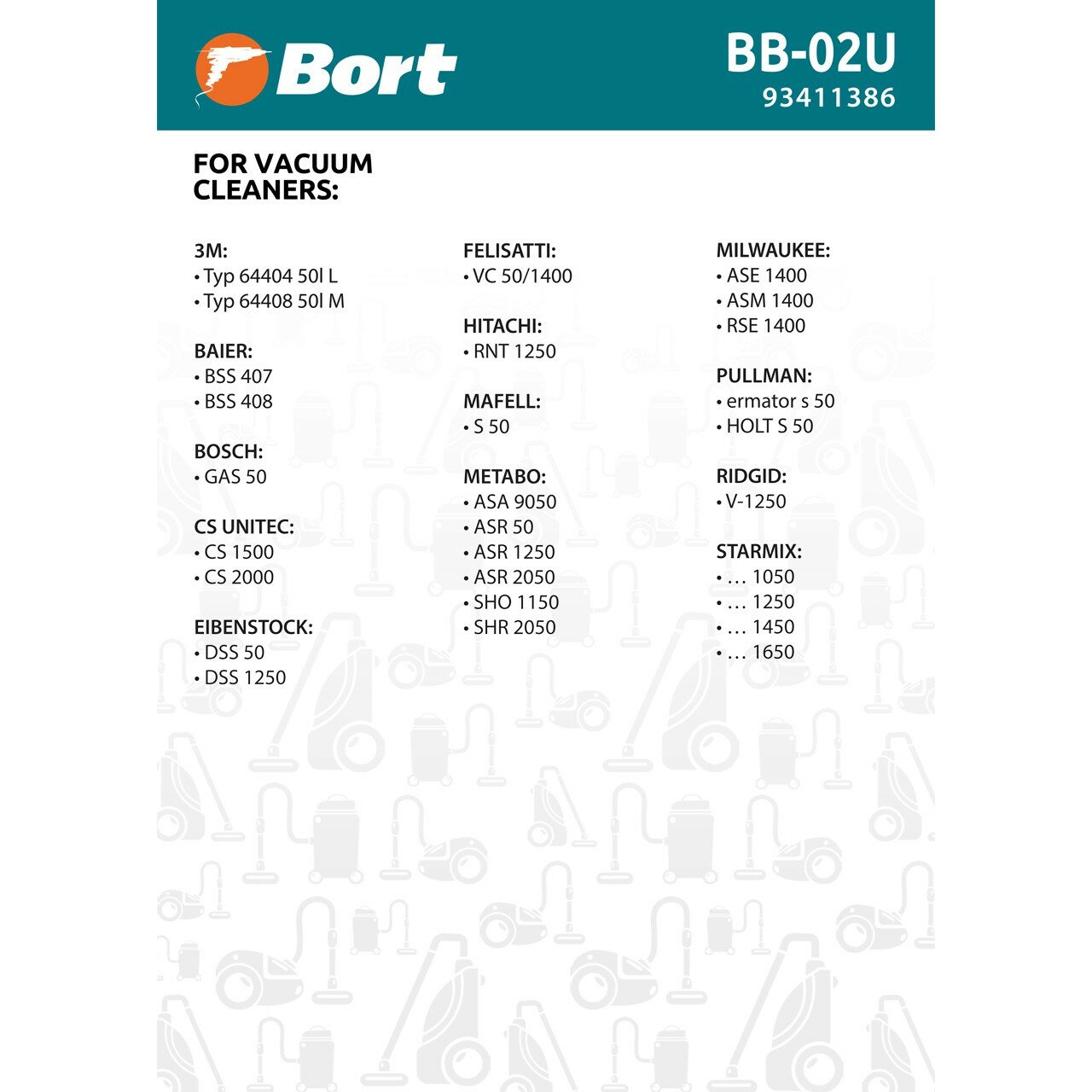 Комплект мешков - пылесборников Bort Совместимость: 3M Typ 64404 50l L 3M Typ 64408 50l M BAIER BSS 407 M BAIER BSS 408 H BAIER BSS 408 M BOSCH GAS 3931 … BOSCH GAS 50 M Professional BOSCH GAS 50 Professional CS UNITEC CS 1500 CS UNITEC CS 1500 H CS UNITEC CS 2000 EIBENSTOCK DSS 50 A EIBENSTOCK DSS 50 M EIBENSTOCK DSS 1250 EIBENSTOCK DSS 1250 M FELISATTI VC 50/1400 HITACHI RNT 1250 HITACHI RNT 1250 M HITACHI RNT 1250 ML MAFELL S 50 MAFELL S 50 M METABO ASA 9050 METABO ASR 50 L METABO ASR 50 L SC METABO ASR 50 M METABO ASR 50 M SC METABO ASR 1250 METABO ASR 2050 METABO SHO 1150 METABO SHR 2050 M MILWAUKEE ASE 1400 MILWAUKEE ASM 1400 MILWAUKEE RSE 1400 PULLMAN ermator s 50 PULLMAN HOLT S 50 RIDGID V-1250 STARMIX ISC ARD 1250 EWS STARMIX ISC ARD 1450 EWS STARMIX ISC ARDL-1450 EWS COMPACT STARMIX ISC ARDL-1650 EWS COMPACT STARMIX ISC L-1650 EWS TOP STARMIX ISP ARH 1050 ASBEST EW STARMIX ISP ARM 1250