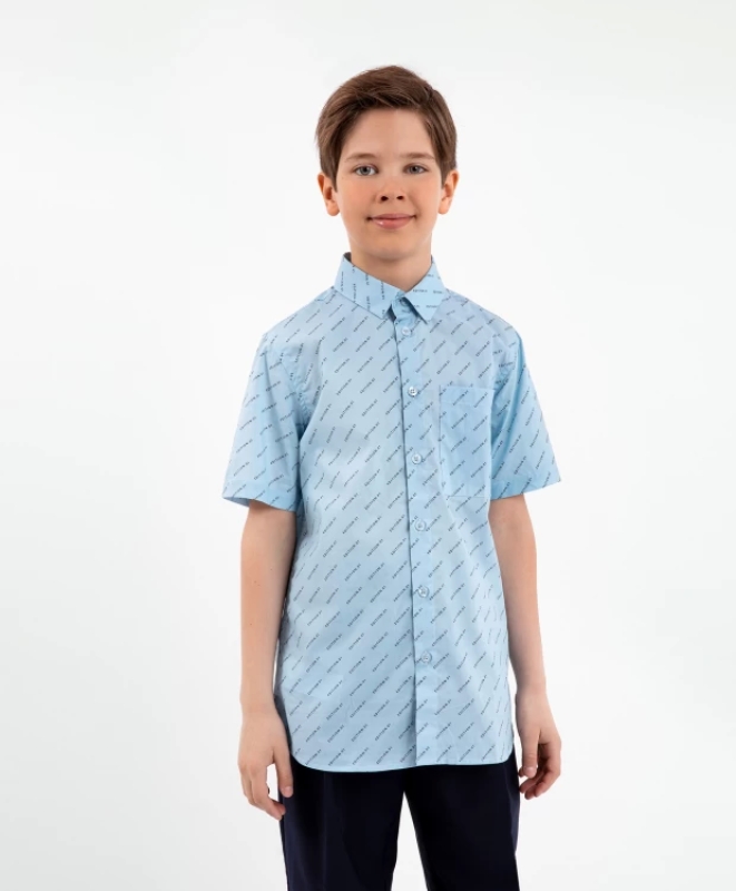 Голубая сорочка с коротким рукавом из 100% хлопковой ткани с мелким неброским рисунком, расположенным по диагонали, сделает образ школьника стильным, динамичным, деловым. Сорочка приталенного силуэта(Slim fit) может стать отличным компаньоном как к классическому костюму, так и к кэжуальному комплекту с джинсами, кардиганом, жилетом. В оформлении сорочки использованы отделочные детали и элементы дизайна: внутренняя планка с шрифтовым принтом и нашивка на кокетке спинки с контрастными шрифтовыми элементами. Сорочка застегивается на пуговицы.