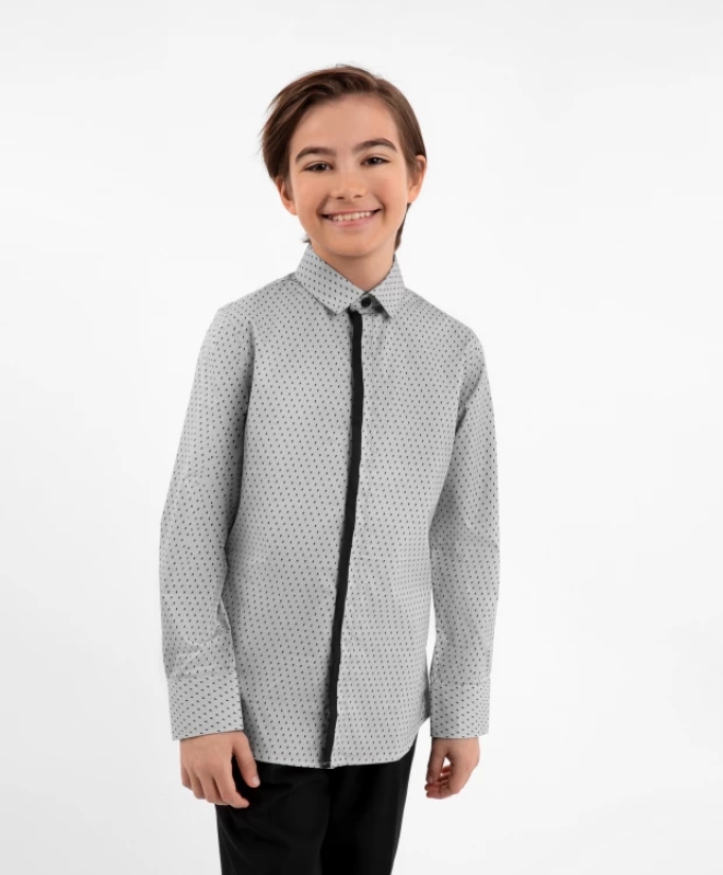 Серая сорочка с длинным рукавом из смесовой ткани с преобладанием хлопка, с модным мелким рисунком сделает образ школьника стильным, динамичным, деловым. Сорочка приталенного силуэта силуэта(slim fit) может стать отличным компаньоном как к классическому костюму, так и к кэжуальному комплекту с джинсами, чиносами, кардиганом, жилетом. В оформлении сорочки использованы отделочные детали и элементы дизайна: внутренняя часть суппатной планки, переходящая на внешнюю сторону в виде контрастного канта, стойка воротника и нашивка на кокетке спинки с шрифтовыми элементами.