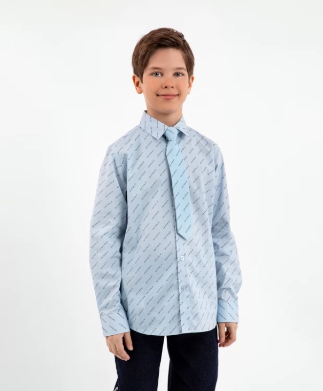 Голубая сорочка с длинным рукавом из 100% хлопковой ткани с мелким неброским рисунком, расположенным по диагонали, сделает образ школьника стильным, динамичным, деловым. Сорочка прямого силуэта(regular fit) может стать отличным компаньоном как к классическому костюму, так и к кэжуальному комплекту с джинсами, кардиганом, жилетом. В оформлении сорочки использованы отделочные детали: внутренняя планка с шрифтовым принтом и нашивка на кокетке спинки с контрастными шрифтовыми элементами. В качестве модного аксессуара к изделию прилагается галстук из такой же ткани, прикрепляющийся к сорочке на клипсе.