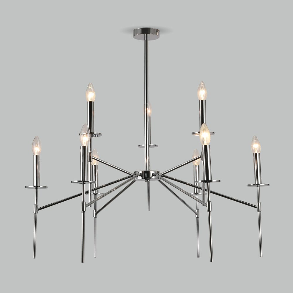 Люстра Anders в цвете хром- это острое сочетание трендовой геометрии и концепции традиционной люстры-канделябра. Девять открытых источников света без привычных для нас стеклянных плафонов подчеркивают четкость линий модели и оригинальность задумки. В светильнике используются сменные лампы с цоколем E14. Благодаря гармоничному сочетанию классических и современных дизайн-приемов потолочный светильник Anders создаст запоминающийся визуальный образ в любом интерьере гостиной, спальни или кухни.