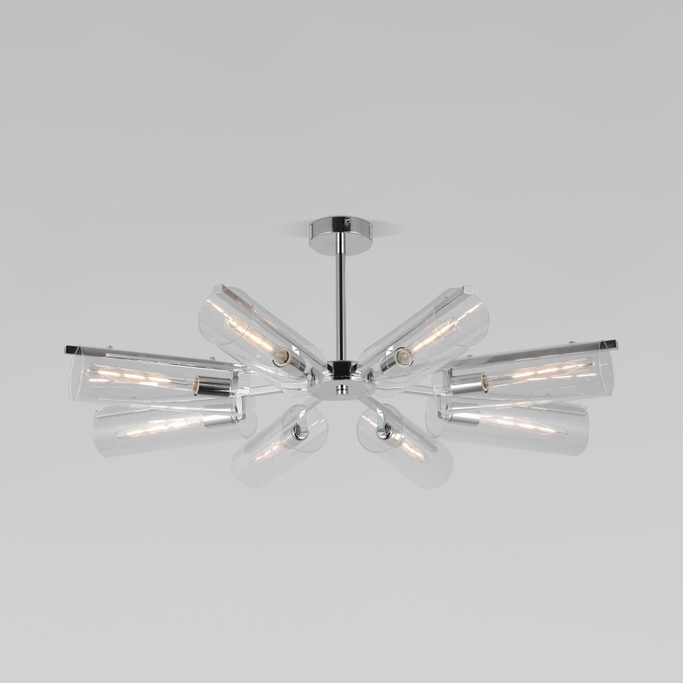 Потолочный светильник с 8 рожками в цвете хром, предназначен для создания основного освещения в современных и классических интерьерах, подходит для различных типов помещений: гостиная, спальня и рассчитан на площадь освещения 16 м².Роскошный светильник оснащен патронами с цоколем Е14, которые рассчитаны на максимальную мощность ламп 60 Вт. Потолочный светильник дополнен выразительными стеклянными плафонами. Арматура изготовлена из высококачественного металла с надежным защитным покрытием. Светильник совместим с умным выключателем м умным реле.