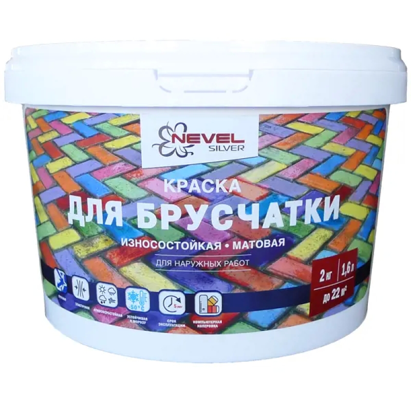 **Краска Nevel** — матовое покрытие для брусчатки, бордюров, тротуарной плитки. Не подходит для поверхностей, предназначенных для проезда транспорта. База типа С используется для ручной или компьютерной колеровки в яркие цвета пастами на водной основе. Образует на поверхности покрытие, устойчивое к влаге и температурным перепадам. Наносится кистью, валиком или краскопультом. Время высыхания — 24 ч. Краска произведена в России, поставляется в ведрах объёмом 1,6 л.