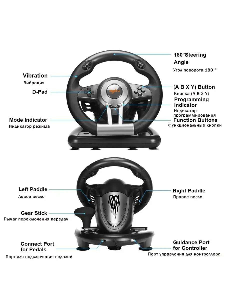 PXN V3 PRO - игровой руль с педалями с реалистичной конструкцией для ПК, PS3-4, XBox One и Nintendo Switch. Может фиксироваться на горизонтальной поверхности за счет клейких присосок. Поддерживает обратную связь и вибрацию, что гарантирует вам полное погружение и делает процесс игры более реалистичным. На руле есть износостойкая прорезиненная оплетка, благодаря которой руки не соскальзывают и держатся крепче. За счёт вращения на 180 градусов достигается эргономичность настоящего руля, а 6 передач имитируют подрулевой переключатель гоночного автомобиля. В комплекте идут складные педали с функцией газа и тормоза.