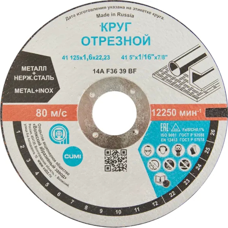 Диск отрезной по стали Волжский Абразивный Завод 125x22.2x1.6 мм