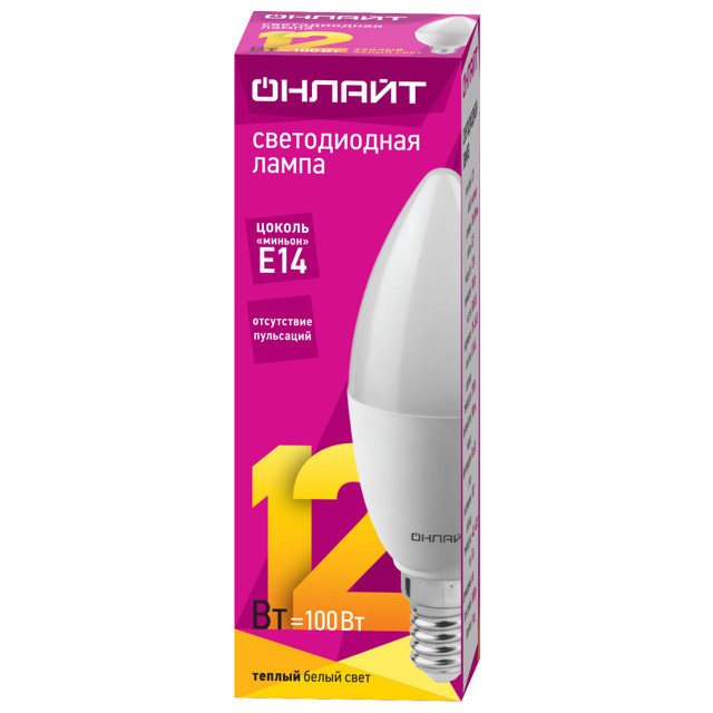 лампа светодиодная ОНЛАЙТ 12Вт E14 230В 900Лм 2700K матовый свеча