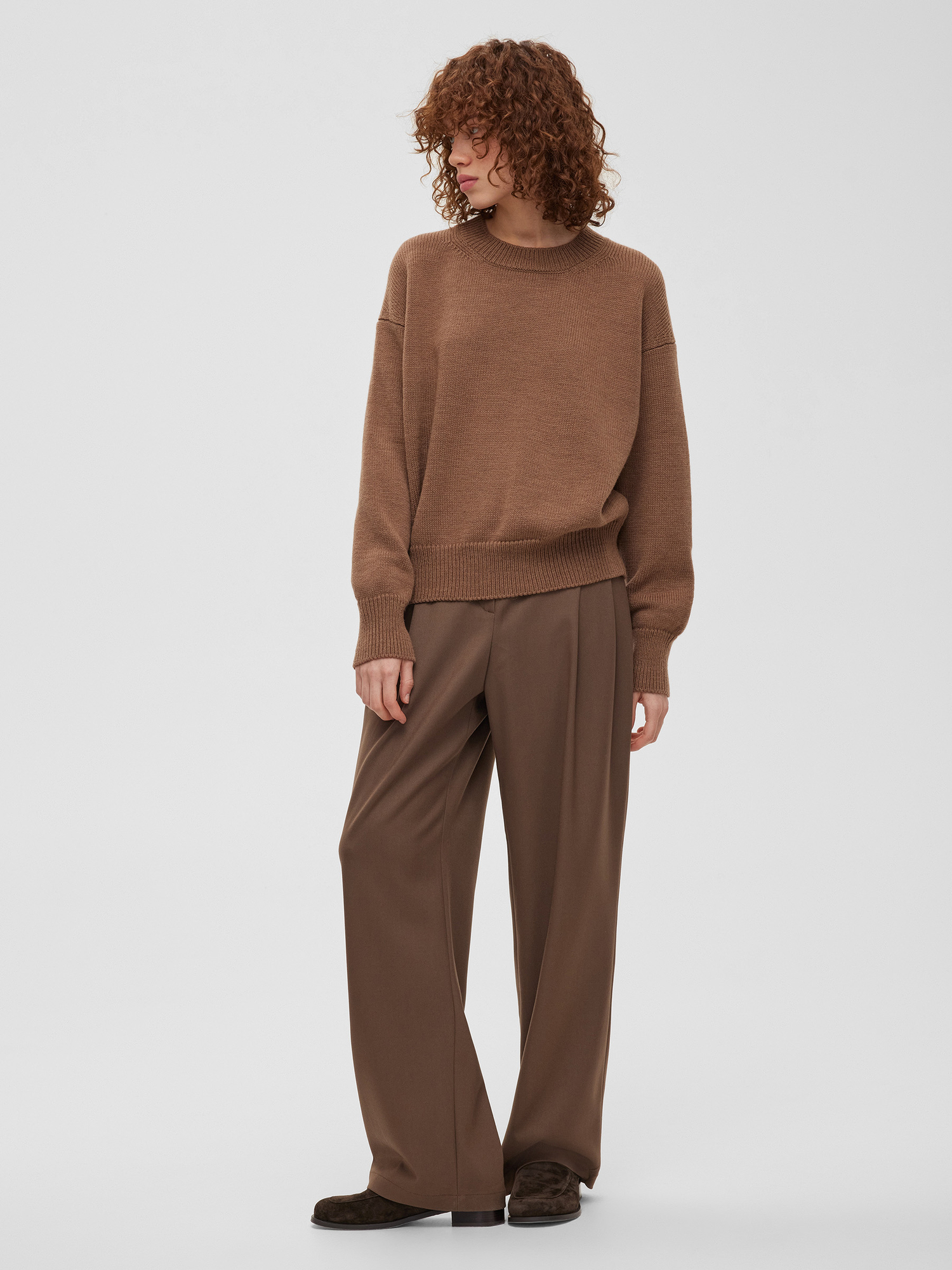 Джемпер свободного кроя с круглой горловиной и мягкой линией плеча — одна из самых любимых базовых моделей Aim Clo, к которой клиенты возвращаются снова и снова, выбирая её в разных оттенках. Спокойный силуэт и комфортная посадка делают его надёжной частью повседневного гардероба.Его легко комбинировать с юбками и брюками, а также использовать в многослойных образах с рубашкой или носить как самостоятельный акцент. Это база, которая остаётся актуальной из сезона в сезон.