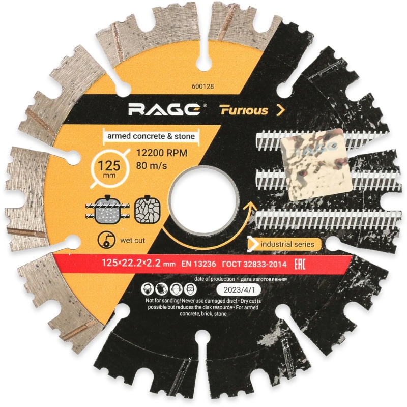 Диск алмазный сегментный по железобетону и камню Rage 600128 125x22.23x2.2 мм