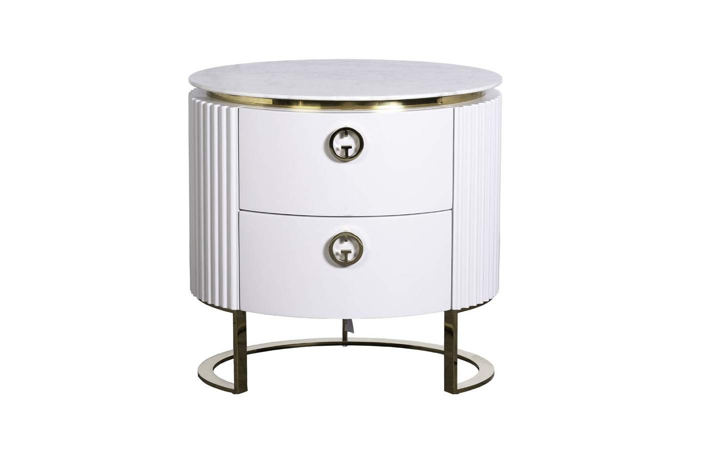 Эффектно завершить дизайн спальни или гостиной поможет тумбочка с мраморной столешницей и вставками из нержавеющей стали под золото. Такая модель отлично смотрится в интерьерах стилей шебби-шик и ар-деко. Белый цвет делает ее универсальным решением, которое можно сочетать как с классической пастельной, так и яркой цветовой палитрой. Прикроватная тумбочка для спальни с оригинальной металлической ножкой в форме полукруга и округлой белоснежной основой наполнит помещение атмосферой уюта и тепла. Выдвижные ящики позволяют спрятать личные вещи и разгрузить комнату. В каталоге со стильной дизайнерской тумбочкой также представлены комод, тумба под телевизор и консоль с мраморной столешницей.