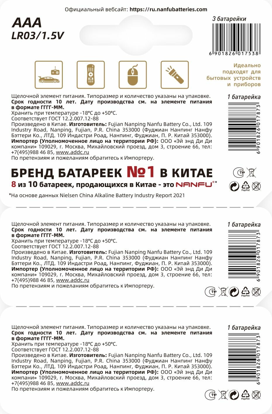 - Производитель: Fujian Nanping Nanfu Battery Co., Ltd